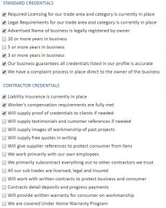Businesses and contractors must understand that consumers can view and search their credentials. The Site will not score or validate credentials; consumers are responsible for their own decisions. Therefore, businesses and contractors must take responsibility for ensuring the accuracy of their credentials.