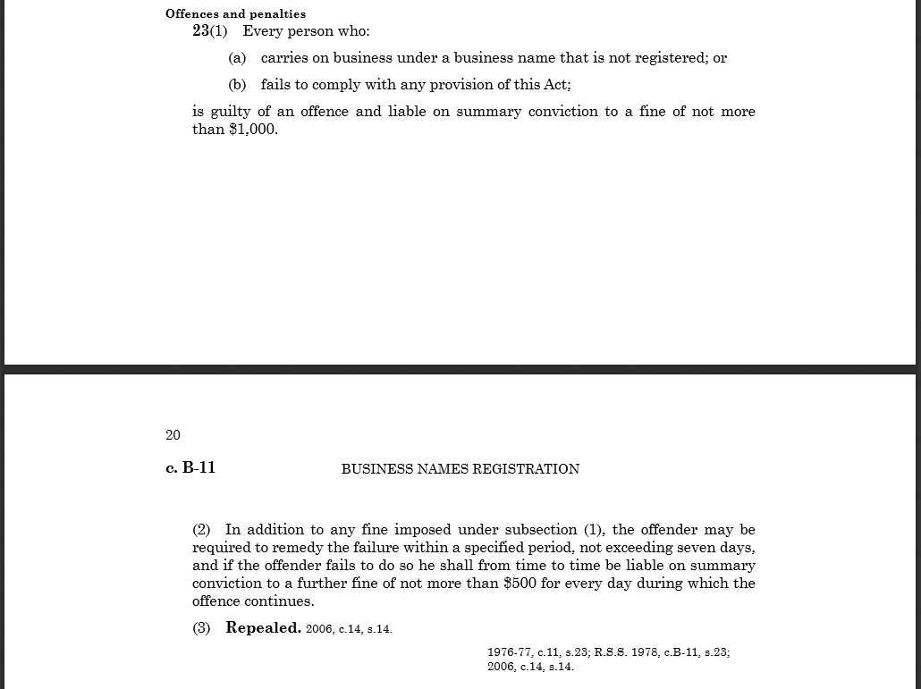 In Saskatchewan there are laws regarding the registration and use of a business name. The Business Names Registration Act indicates that a business using a name that is not registered is guilty of an offence and continued non-compliance results in even more fines.